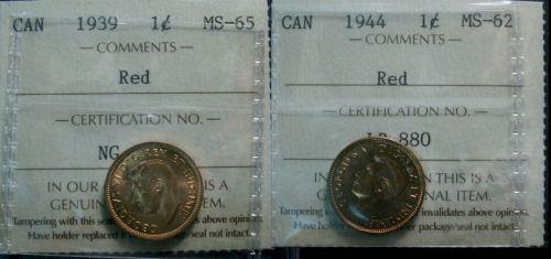 1939 1¢ ICCS MS65RD & 1944 ICCS MS62RD. Lot of 2 coins both full red and lustrous.
