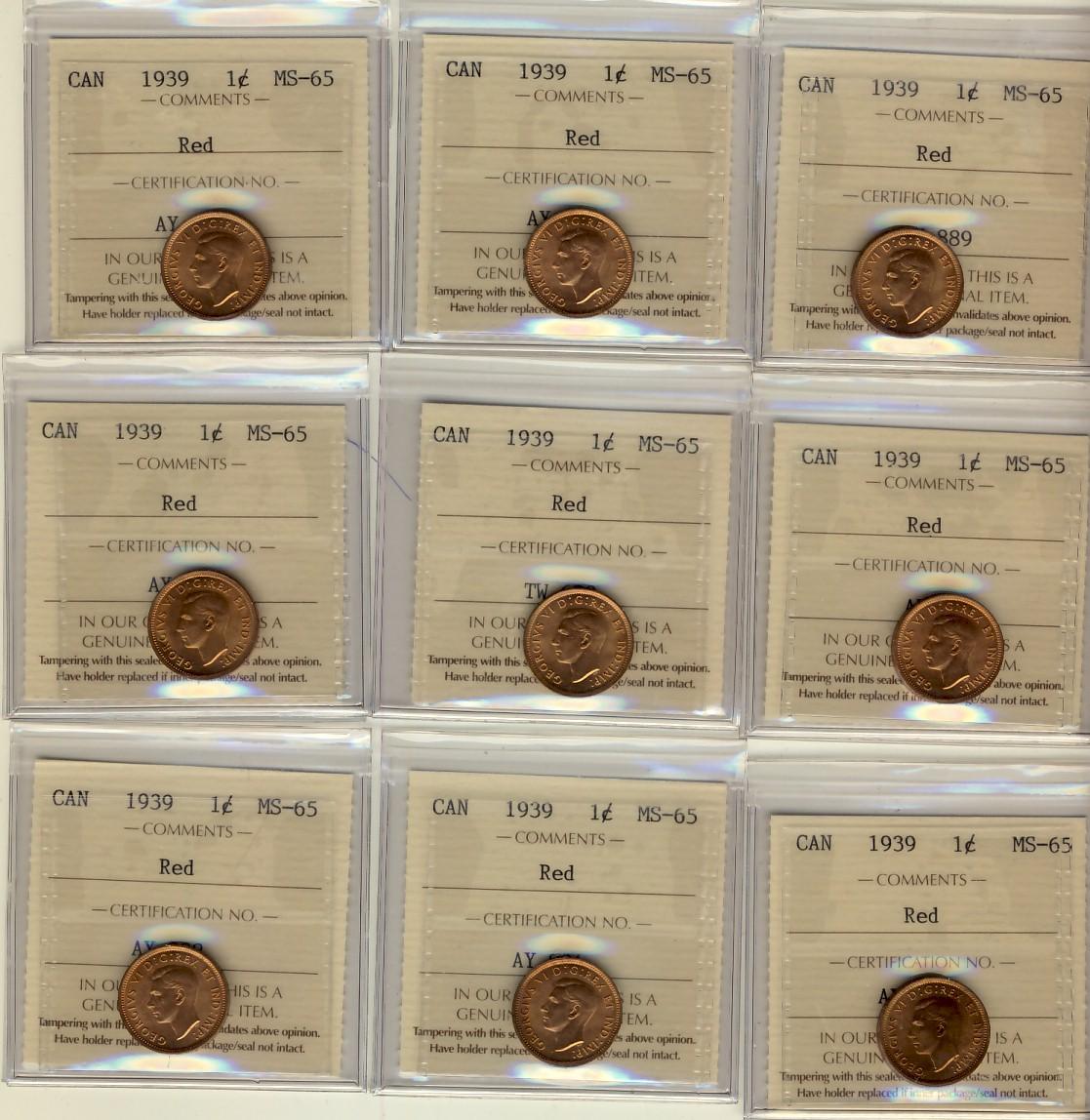 1939 1¢ ICCS MS65RD. Lot of 9 coins.