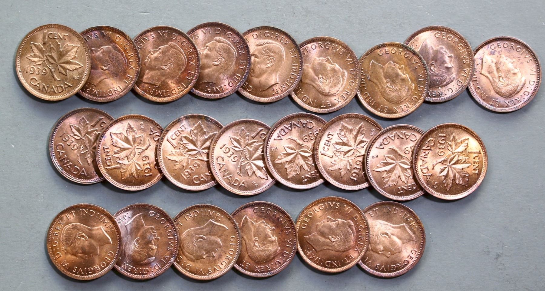 1939 1¢ Lot of 23 lustrous UNC to MS Red & RB pcs. See Pic.
