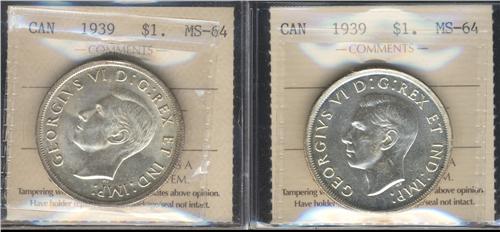 1939 $1. Lot of two gem mintstate examples certified ICCS MS64,