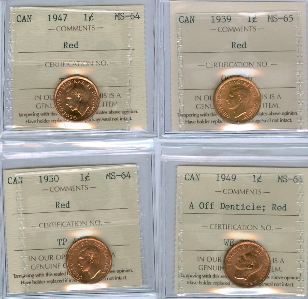 1939 1¢ MS65 and 1947, 1949 A off and 1950 1¢ ICCS MS64RD. Lot of 4 coins all full red.