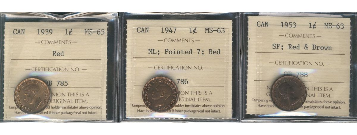 1939 1¢ MS65RD, 1953 SF MS63RB & 1947 ML Ptd MS63RD. Lot of 3 ICCS coins.