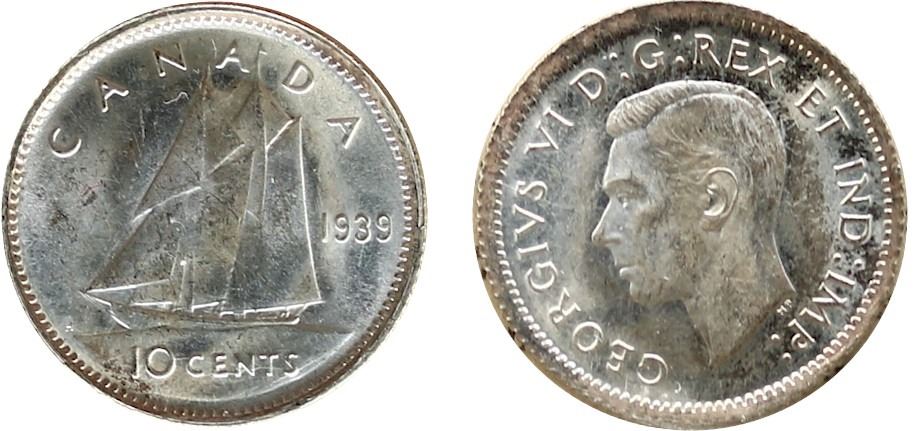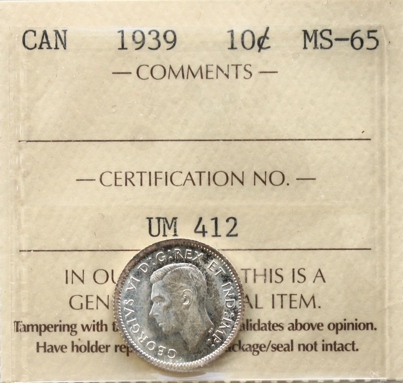 1939 10¢ ICCS Gem Mint State-65. Blast white example.