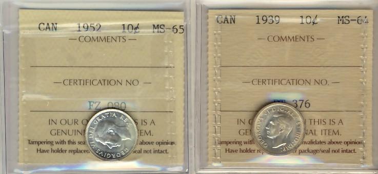 1939 10¢ MS64 & 1952 MS65. Lot of 2 ICCS coins.
