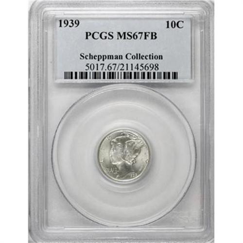 <B>1939 10C MS67 Full Bands PCGS.</B></I> Shining and sharply struck with rewarding visual appeal. This beautifully preserved survivor ranks highly in the PCGS <I>Population Report</B></I>, with just five finer coins in its classification (12/07). Pale gold and silver-blue toning graces the surfaces.<BR><I>From The Scheppman Collection, #4 PCGS Registry of Full Band Mercury Dimes.</B></I><BR><BR><B>Coin Engraver:</B> Adolph A. Weinman<BR><BR><b>Shipping:</b> Coins & Currency (<a target="_blank" href="http://www.heritageauctions.com/common/shipping.php">view shipping information</a>)