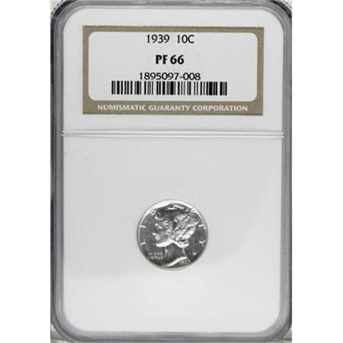 <B>1939 10C PR66 NGC.</B></I> NGC Census: (723/463). PCGS Population (844/463). Mintage: 9,321. Numismedia Wsl. Price for NGC/PCGS coin in PR66: $360. (#5074)<BR><BR><B>Coin Engraver:</B> Adolph A. Weinman<BR><BR><b>Shipping:</b> Coins & Currency (<a target="_blank" href="http://www.heritageauctions.com/common/shipping.php">view shipping information</a>)