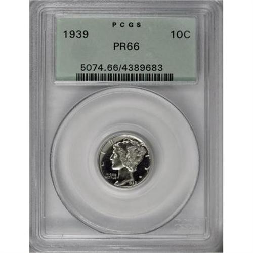 <B>1939 10C PR66 PCGS.</B></I> PCGS Population (848/461). NGC Census: (716/421). Mintage: 9,321. Numismedia Wsl. Price for NGC/PCGS coin in PR66: $360. (#5074)<BR><BR><B>Coin Engraver:</B> Adolph A. Weinman<BR><BR><b>Shipping:</b> Coins & Currency (<a target="_blank" href="http://www.heritageauctions.com/common/shipping.php">view shipping information</a>)