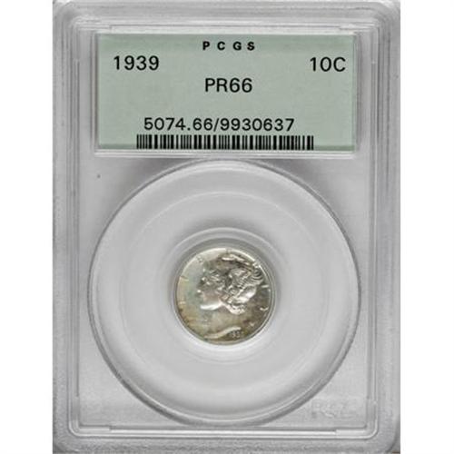 <B>1939 10C PR66 PCGS.</B></I> PCGS Population (845/464). NGC Census: (724/466). Mintage: 9,321. Numismedia Wsl. Price for NGC/PCGS coin in PR66: $360. (#5074)<BR><BR><B>Coin Engraver:</B> Adolph A. Weinman<BR><BR><b>Shipping:</b> Coins & Currency (<a target="_blank" href="http://www.heritageauctions.com/common/shipping.php">view shipping information</a>)