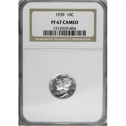 <B>1939 10C PR67 Cameo NGC.</B></I> Fully struck and untoned, with delicately frosted devices and unimpeded reflectivity in the fields. The surfaces are exquisitely preserved and lack any bothersome marks or hairlines. Proof Mercury dimes are infrequently seen with the Cameo designation. Census: 7 in 67 Cameo, 1 finer (11/07). <BR><BR><b>Shipping:</b> Coins & Currency (<a target="_blank" href="http://www.heritageauctions.com/common/shipping.php">view shipping information</a>)