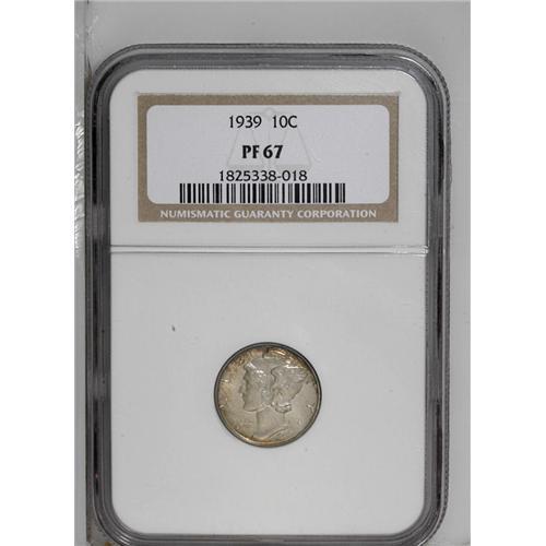 <B>1939<10C> PR67 NGC.</B></I> Peach, lemon, and forest-green illuminate the margins of this needle-sharp and pristine Superb Gem. A solid example from one of the scarcer dates of the series.