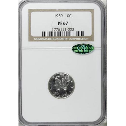 <B>1939 10C PR67 NGC. CAC.</B></I> A decisively struck, minimally toned Superb Gem specimen from this mid-date proof Mercury dime issue, silver-white with gleaming mirrors. Beautifully preserved with undeniable visual appeal. NGC has certified 57 numerically finer examples (1/08).<BR><BR><B>Coin Engraver:</B> Adolph A. Weinman<BR><BR><b>Shipping:</b> Coins & Currency (<a target="_blank" href="http://www.heritageauctions.com/common/shipping.php">view shipping information</a>)