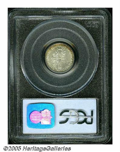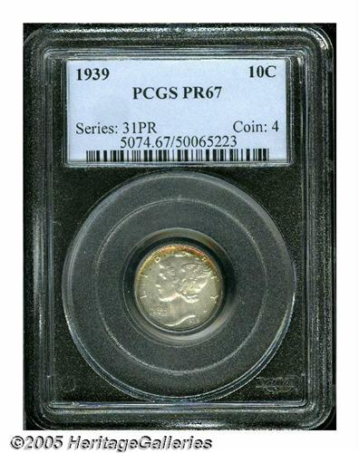 <B>1939<10C> PR67 PCGS.</B></I> Iridescent russet patina hugs the rims of this otherwise cream-gray premium Gem. It possesses bold strike detail and nearly flawless surfaces.
