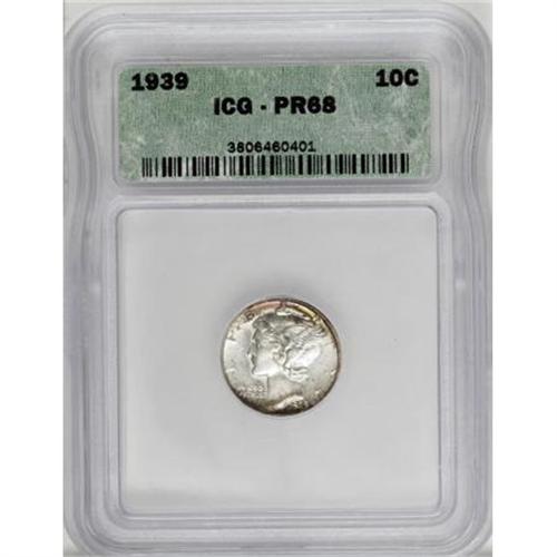<B>1939 10C PR68 ICG.</B></I> NGC Census: (57/0). PCGS Population (30/0). Mintage: 9,321. Numismedia Wsl. Price for NGC/PCGS coin in PR68: $2,750. (#5074)<BR><BR><B>Coin Engraver:</B> Adolph A. Weinman<BR><BR><b>Shipping:</b> Coins & Currency (<a target="_blank" href="http://www.heritageauctions.com/common/shipping.php">view shipping information</a>)
