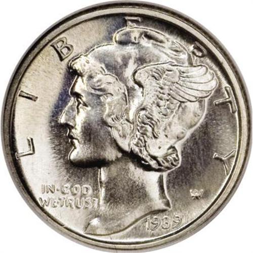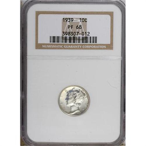 <B>1939 10C PR68 NGC.</B></I> At the lofty PR68 grade, this piece is tied for the finest certified by either NGC or PCGS. The surfaces are fully mirrored with a hint of iridescent blue toning on the obverse. All details are boldly defined, and the devices show a faint trace of contrast, although clearly not sufficient for a Cameo designation. Census: 52 in 68, 0 finer (6/07).<BR><BR><b>Shipping:</b> Coins & Currency (<a target="_blank" href="http://www.heritageauctions.com/common/shipping.php">view shipping information</a>)