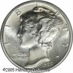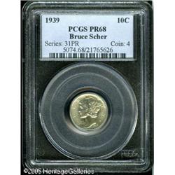 <B>1939 10C PR68 PCGS.</B></I> Another wonderfully preserved proof Mercury, this specimen has a dusting of golden-gray patina over both sides and appears to be devoid of even the slightest blemish. Population: 29 in 68, 0 finer (1/05).<BR><I>From the Bruce Scher #1 All-Time PCGS Registry Set.</B></I> Lot:4079