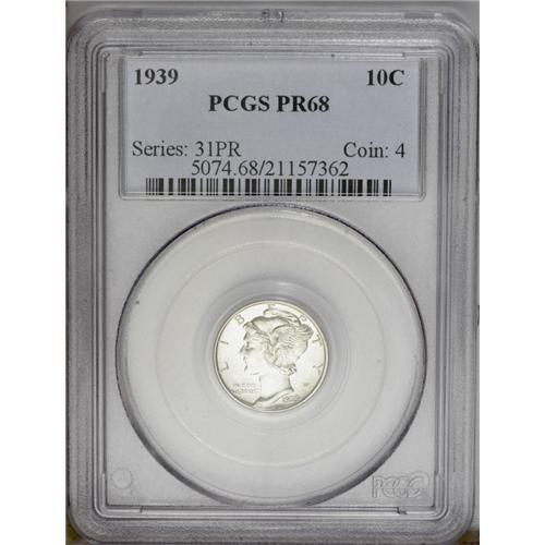 <B>1939<10C> PR68 PCGS.</B></I> Gentle lime-green and rose patina appears in the fields. A needle-sharp, carefully preserved Superb Gem that has seemingly pristine surfaces. Scarcer than the proof issues from the 1940s, and a worthwhile addition to any Registry Set. Population: 29 in 68, 0 finer (4/06).