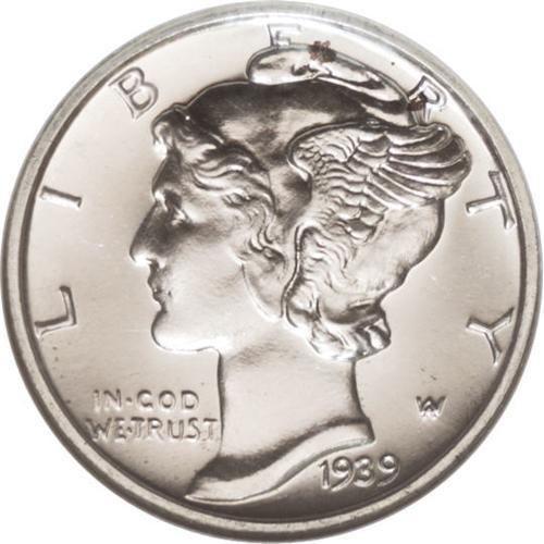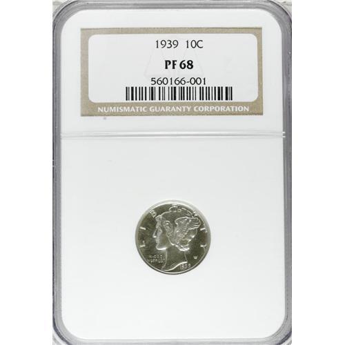 <B>1939 10C PR68 NGC.</B></I> This mid-date proof Mercury dime issue amounted to just 9,321 pieces, the last regular-issue proof dime not to have a five-figure mintage. Both sides display as blast-white with only the slightest hint of silver-gray patina at the margins. Exceedingly well-preserved with plenty of visual appeal. Neither NGC nor PCGS has graded a PR69 example (4/07).<BR><BR><b>Shipping:</b> Coins & Currency (<a target="_blank" href="http://www.heritageauctions.com/common/shipping.php">view shipping information</a>)