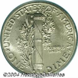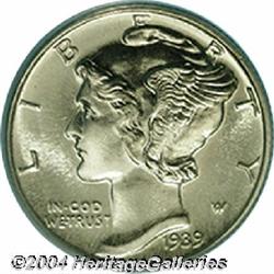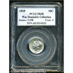 <B>1939<10C> PR68 PCGS.</B></I> Ex: William Dominick Collection. A conditionally rare offering, both sides are faintly overlaid in golden iridescence that does not inhibit the depth of reflectivity in the fields. The devices are equally as bright, and there are no grade-limiting contact marks or hairlines. Population: 30 in 68, 0 finer (9/04). <BR><BR><B>Important notice:</B> Heritage usually auctions material at the rate of 200-250 lots per hour. On some occasions eBay Live bid software or the Internet may not be able to keep up with the pace of the auction. We recommend placing a realistic absentee bid now as insurance to avoid disappointment. Occasionally the auctioneer may eliminate or reject an eBay Live bid, and the auctioneer may also reopen a lot after the close of the eBay live bidding (usually because we missed an audience bid), and may reject your bid even if it shows you as the winning bidder. By bidding via eBay Live, you agree that Heritage may award the lot to another bidder at its sole discretion under the circumstances described above or any other reasonable circumstances. Since eBay bids are not shown to us until we open the lot on the floor, we treat those bids just like floor bids. In most cases the floor responds before the eBay bid is presented to us, due to Internet lag time, so for consistency we have made it a policy that floor bids are always considered first over tie eBay live bids. Also please note that all Heritage lots purchased through eBay Live carry a 20% Buyer's Premium. Please make sure you read the Terms and Conditions before you bid.
