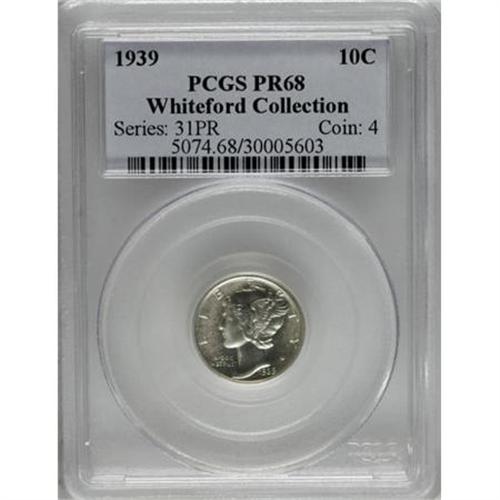 <B>1939 10C PR68 PCGS.</B></I> Ex: Whiteford Collection. An essentially as struck specimen that is separated from full brilliance by an arc of pale milky patina on the left side of the obverse. While certainly not a scarcity in Gem condition, the population at this lofty grade level thins out rapidly. Population: 30 in 68, 0 finer (7/07).<BR><BR><B>Coin Engraver:</B> Adolph A. Weinman<BR><BR><b>Shipping:</b> Coins & Currency (<a target="_blank" href="http://www.heritageauctions.com/common/shipping.php">view shipping information</a>\)