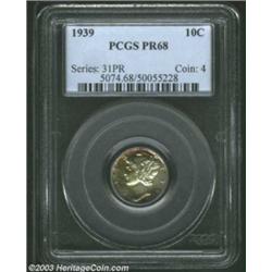 <TABLE cellSpacing=0 cellPadding=0 width="100%" bgColor=#000000 border=0><TBODY><TR><TD width="100%"><TABLE cellSpacing=1 cellPadding=3 width="100%" border=0><TBODY><TR><TD width="100%" bgColor=#79735c><FONT face=arial color=#ffffff size=3><B>Description</B> </FONT></TD></TR><TR><TD width="100%" bgColor=#ffffff><FONT face=arial size=2><B>1939 10C PR68 PCGS.</B></I> A moderately scarce date among proof Mercury Dimes, the present Superb Gem is unsurpassable at either NGC or PCGS. Fully original with streaky, multicolored iridescence on the obverse, rich golden-red circles the reverse periphery. The uniformly reflective features are smooth from rim to rim. Powerfully impressed. Population: 23 in 68, 0 finer (8/03). </FONT></TD></TR></TBODY></TABLE></TD></TR></TBODY></TABLE><BR><A name=PricesRealized></A><TABLE cellSpacing=0 cellPadding=0 width="100%" bgColor=#000000 border=0><TBODY><TR><TD width="100%"><TABLE cellSpacing=1 cellPadding=3 width="100%" border=0><TBODY><TR><TD width="100%" bgColor=#79735c><A name=PR><FONT face=arial color=#ffffff size=3><B>Previous Prices from Heritage Auctions</B> </FONT></A></TD></TR><TR><TD bgColor=#f6f6ed><TABLE cellSpacing=0 cellPadding=0 width="100%" border=1><TBODY><TR><TD align=middle width="33%"><B>Date</B></TD><TD align=middle width="33%"><B>Service</B></TD><TD align=middle width="33%"><B>Price</B></TD></TR><TR bgColor=whitesmoke><TD width="33%"><B>05/31/2003</B></TD><TD width="33%">PCGS</TD><TD width="33%">$3,335.00</TD></TR><TR bgColor=whitesmoke><TD width="33%"><B>03/03/2003</B></TD><TD width="33%">PCGS</TD><TD width="33%">$2,587.50</TD></TR><TR bgColor=whitesmoke><TD width="33%"><B>07/30/2002</B></TD><TD width="33%">PCGS</TD><TD width="33%">$2,645.00</TD></TR><TR bgColor=whitesmoke><TD width="33%"><B>04/27/2002</B></TD><TD width="33%">PCGS</TD><TD width="33%">$3,105.00</TD></TR><TR bgColor=whitesmoke><TD width="33%"><B>10/06/2001</B></TD><TD width="33%">PCGS</TD><TD width="33%">$2,771.50</TD></TR><TR bgColor=whitesmoke><TD width="33%"><B>07/17/2001</B></TD><TD width="33%">PCGS</TD><TD width="33%">$3,100.00</TD></TR><TR bgColor=whitesmoke><TD width="33%"><B>04/05/2001</B></TD><TD width="33%">PCGS</TD><TD width="33%">$3,105.00</TD></TR><TR bgColor=whitesmoke><TD width="33%"><B>02/12/1999</B></TD><TD width="33%">PCGS</TD><TD width="33%">$2,300.00</TD></TR><TR bgColor=whitesmoke><TD width="33%"><B>05/31/2003</B></TD><TD width="33%">NGC</TD><TD width="33%">$2,070.00</TD></TR><TR bgColor=whitesmoke><TD width="33%"><B>07/29/2003</B></TD><TD width="33%">NGC</TD><TD width="33%">$1,552.50</TD></TR><TR bgColor=whitesmoke><TD width="33%"><B>06/05/2001</B></TD><TD width="33%">NGC</TD><TD width="33%">$1,450.00</TD></TR><TR bgColor=whitesmoke><TD width="33%"><B>05/01/2001</B></TD><TD width="33%">NGC</TD><TD width="33%">$1,200.00</TD></TR><TR bgColor=whitesmoke><TD width="33%"><B>03/01/1999</B></TD><TD width="33%">NGC</TD><TD width="33%">$1,150.00</TD></TR><TR bgColor=whitesmoke><TD width="33%"><B>04/27/2002</B></TD><TD width="33%">ANACS</TD><TD width="33%">$632.50</TD></TR></TBODY></TABLE></TD></TR><TR><TD bgColor=#ffffff><FONT face=arial size=1 ?>PLEASE NOTE: All prices realized reflect the final hammer price PLUS the buyer's premium in auctions that charge a buyer's premium. Each item has a notation at the top of the listing indicating whether that lot included a buyer's premium. Example: A item that sells with a final hammer price of $100 and a 20% buyer's premium will display with a price realized of $120. All information listed is intended to be as accurate as possible, but errors are possible. Please use this guide carefully and inform us of any inaccuracies. </FONT></TD></TR></TBODY></TABLE></TD></TR></TBODY></TABLE><BR><TABLE cellSpacing=0 cellPadding=0 width="100%" bgColor=#000000 border=0><TBODY><TR><TD width="100%"><TABLE cellSpacing=1 cellPadding=3 width="100%" border=0><TBODY><TR><TD width="100%" bgColor=#79735c colSpan=6><FONT face=arial color=#ffffff size=3><B>Price Guide*</B> </FONT></TD></TR><TR bgColor=#f6f6ed><TD align=middle><B>Grade</B> </TD><TD align=middle><B>Coin World<BR>(Trends)</B> </TD><TD align=middle><B>Numismedia<BR>Retail</B> </TD><TD align=middle><B>Numismedia<BR>Wholesale</B> </TD><TD align=middle><B>Coin<BR>Universe</B> </TD><TD align=middle><B>Heritage<BR>Value Index</B> </TD></TR><TR bgColor=#ffffff><TD align=middle>67</TD><TD align=right>---</TD><TD align=right>$960.00</TD><TD align=right>$765.00</TD><TD align=right>$875.00</TD><TD align=right>$593.75</TD></TR><TR style="FONT-WEIGHT: bold" bgColor=#cccfdd><TD align=middle>68</TD><TD align=right>---</TD><TD align=right>---</TD><TD align=right>$2,075.00</TD><TD align=right>$3,500.00</TD><TD align=right>$2,518.75</TD></TR><TR bgColor=#ffffff><TD align=middle>69</TD><TD align=right>---</TD><TD align=right>---</TD><TD align=right>---</TD><TD align=right>---</TD><TD align=right>---</TD></TR><TR bgColor=#ffffff><TD colSpan=6><FONT size=1>*All information listed is intended to be as accurate as possible, but errors are possible. No item may be returned or refused based on this information which is provided as a service to our customers. You should contact each pricing source directly to determine the accuracy of this information. </FONT></TD></TR></TBODY></TABLE></TD></TR></TBODY></TABLE><BR><TABLE cellSpacing=0 cellPadding=0 width="100%" bgColor=#000000 border=0><TBODY><TR><TD width="100%"><TABLE cellSpacing=1 cellPadding=3 width="100%" border=0><TBODY><TR><TD width="100%" bgColor=#79735c><FONT face=arial color=#ffffff size=3><B>Population Guide</B> </FONT></TD></TR><TR bgColor=#ffffff><TD align=middle><!-- Begin Output of Population Grid--><TABLE cellSpacing=0 cellPadding=0 width="100%" border=0><TBODY><TR><TD vAlign=center><TABLE cellSpacing=0 width="100%" border=1 cellsadding="3"><TBODY><TR><TD vAlign=center><TABLE cellSpacing=0 cellPadding=3 width="100%" border=1><TBODY><TR><TD vAlign=center align=middle bgColor=#f0f1e8 colSpan=2 <CENTER><FONT face=Arial size=2><B>PCGS Pop </B>
