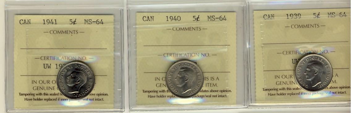 1939, 1940 & 1941 5¢ ICCS MS64. Lot of 3 coins.