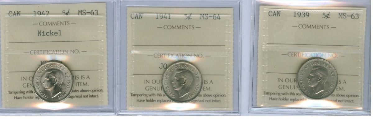 1939, 1941 & 1942 Nickel 5¢. Lot of three coins all ICCS certified. 1939 MS63, 1941 MS64 and 1942 MS63.