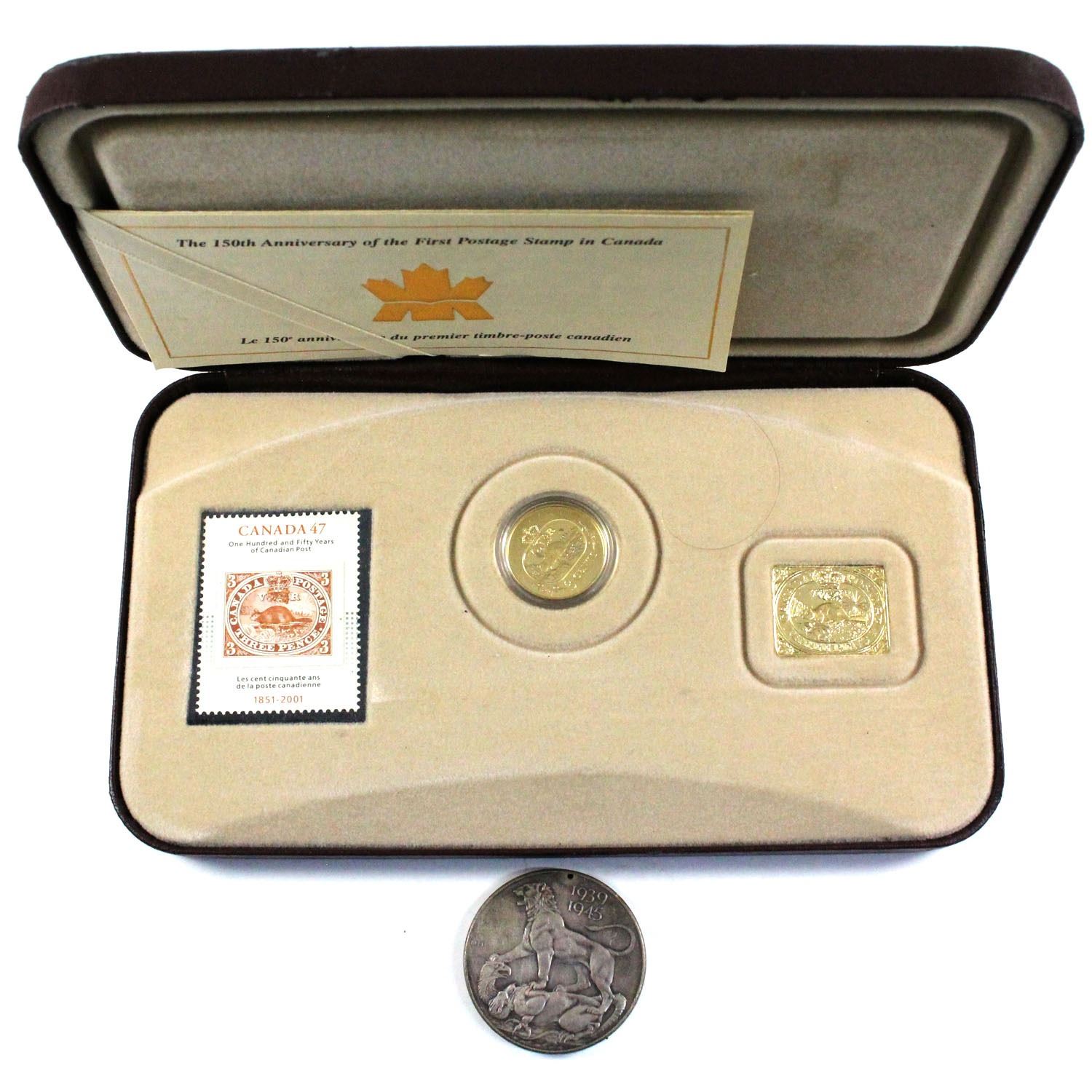 1939-1945 commonwealth World War II Medal & 2001 Canada 3-cent Coin and Stamp Set Commemorating the 150th Anniversary of the First Postage Stamp in Canada (outer box is lightly worn) 2pcs