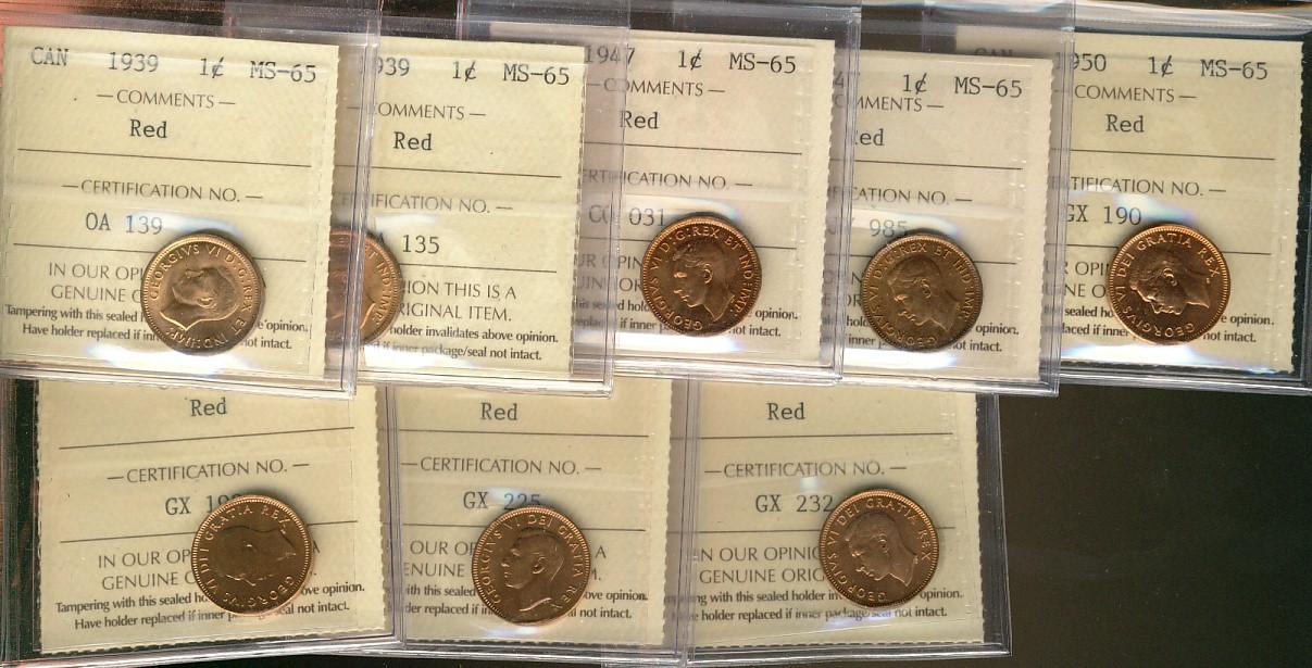 1939, 1947, 1950 & 1952 1¢ ICCS MS65RD. Lot of 8 coins, two of each date.