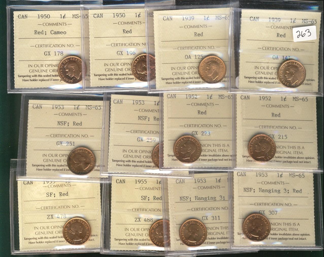 1939, 1950, 1952, 1953 NSF, 1953 NSF Hanging 3 & 1955 1¢ ICCS MS65RD. Lot of 12 coins, two of each
