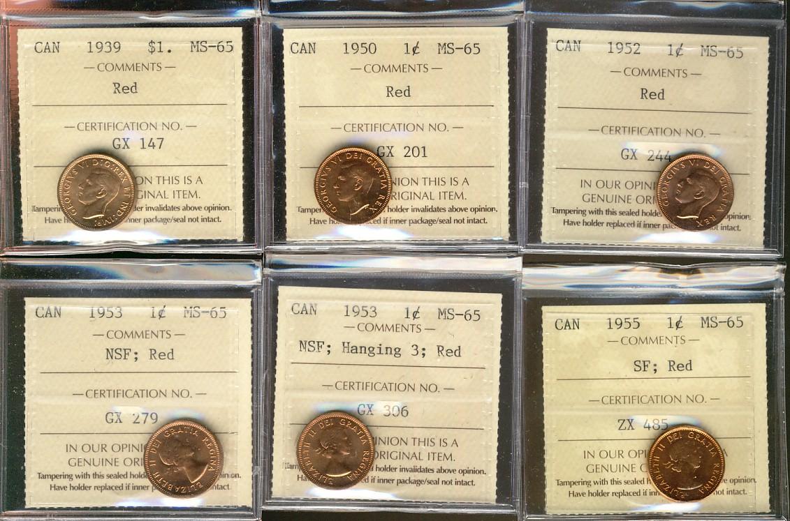 1939, 1950, 1952, 1953 NSF, 1953 NSF Hanging 3 & 1955 1¢ ICCS MS65RD. Lot of 6 coins.