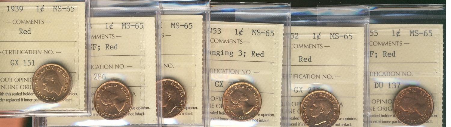 1939, 1950, 1952, 1953 NSF, 1953 NSF Hanging 3 & 1955 1¢ ICCS MS65RD. Lot of 6 coins.
