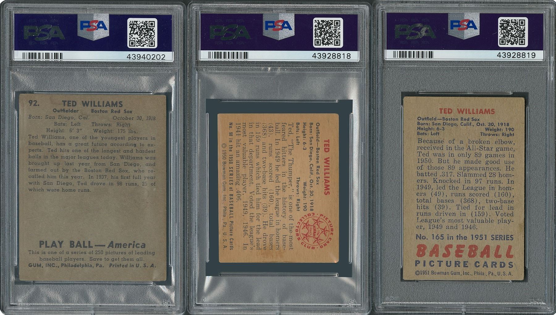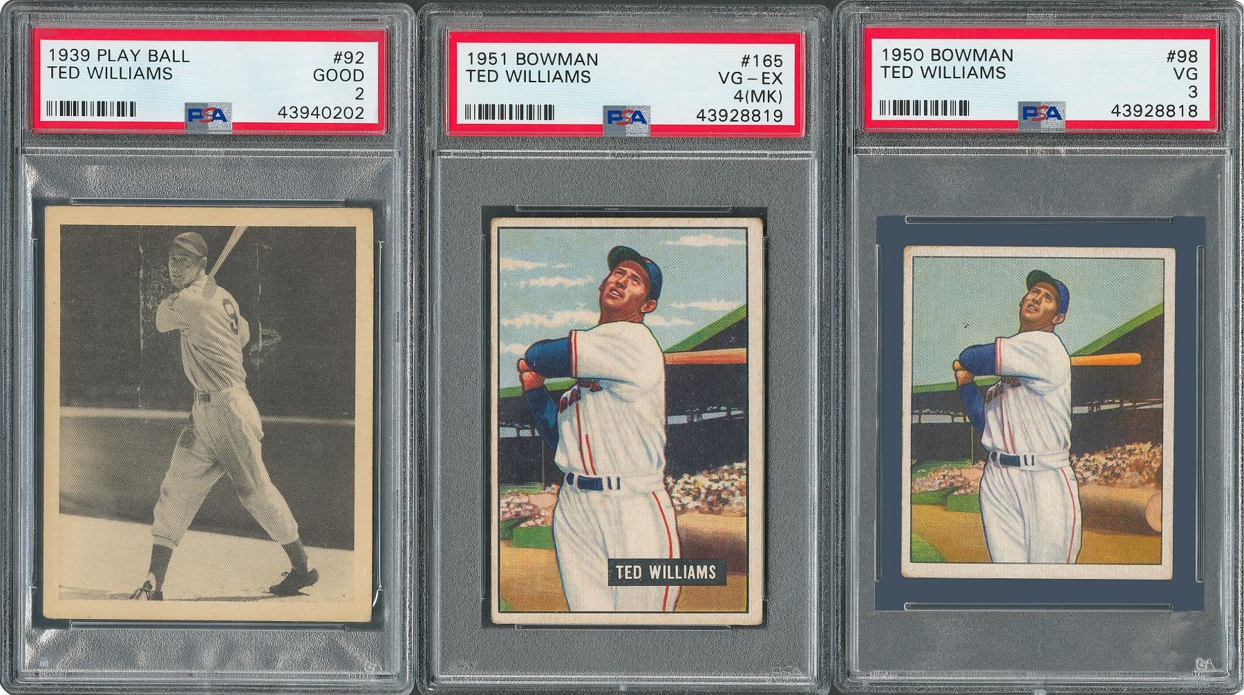 Three early cards of Ted Williams, including his coveted rookie card. All cards have been recently graded by PSA.