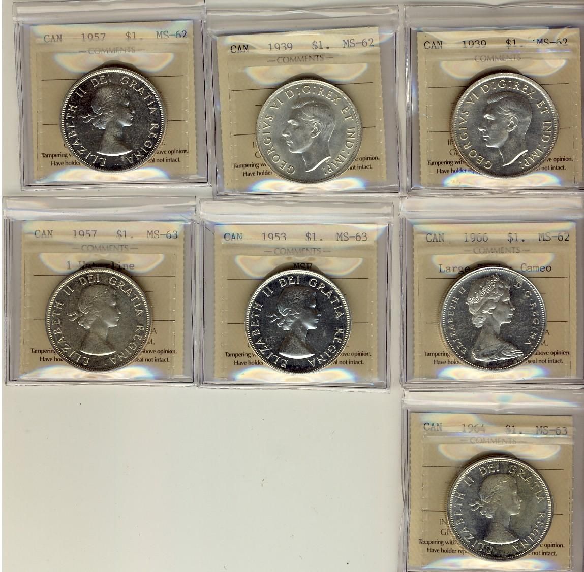 1939(2), 1957, 1966 MS62 and 1953 NSF, 1957 1WL & 1964 MS63. Lot of 7 coins all ICCS graded and the 1966 with Cameo designation.