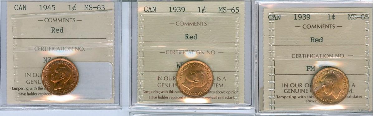 1939(2) MS65RD & 1945 1¢ MS63RD. Lot of 3 coins all ICCS graded.