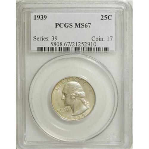 <B>1939 25C MS67 PCGS.</B></I> PCGS Population (195/2). NGC Census: (220/3). Mintage: 33,548,796. Numismedia Wsl. Price for NGC/PCGS coin in MS67: $280. (#5808)<BR><BR><B>Coin Engraver:</B> John Flanagan<BR><BR><b>Shipping:</b> Coins & Currency (<a target="_blank" href="http://www.heritageauctions.com/common/shipping.php">view shipping information</a>\)