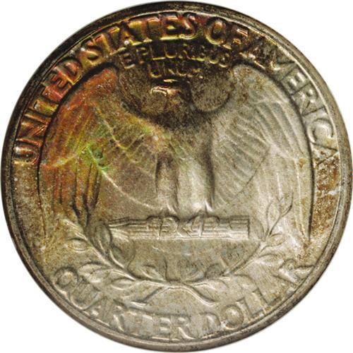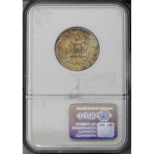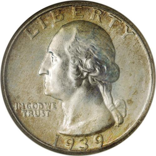 <B>1939<25C> MS68 NGC.</B></I> This assertively struck early Washington Quarter features golden-brown, lavender, lime-green, and olive toning, which is especially iridescent throughout the reverse. As expected of the grade, the lustrous surfaces are virtually unblemished. The combined forces of NGC and PCGS have certified five pieces as MS68, and none have achieved a higher grade.<BR><I>From The Houston Collection of Washington Quarters.</B></I>