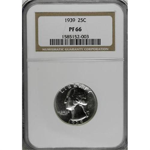 <B>1939 25C PR66 NGC.</B></I> NGC Census: (352/145). PCGS Population (499/121). Mintage: 8,795. Numismedia Wsl. Price for NGC/PCGS coin in PR66: $270. (#5978)<BR><BR><B>Coin Engraver:</B> John Flanagan<BR><BR><b>Shipping:</b> Coins & Currency (<a target="_blank" href="http://www.heritageauctions.com/common/shipping.php">view shipping information</a>)