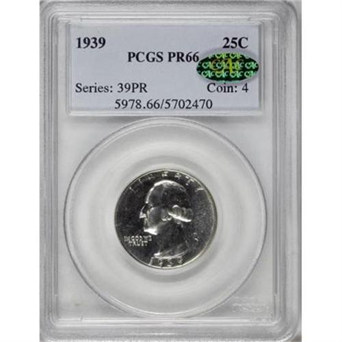 <B>1939 25C PR66 PCGS.</B></I> CAC. PCGS Population (508/124). NGC Census: (360/166). Mintage: 8,795. Numismedia Wsl. Price for NGC/PCGS coin in PR66: $270. (#5978)<BR><BR><B>Coin Engraver:</B> John Flanagan<BR><BR><b>Shipping:</b> Coins & Currency (<a target="_blank" href="http://www.heritageauctions.com/common/shipping.php">view shipping information</a>)