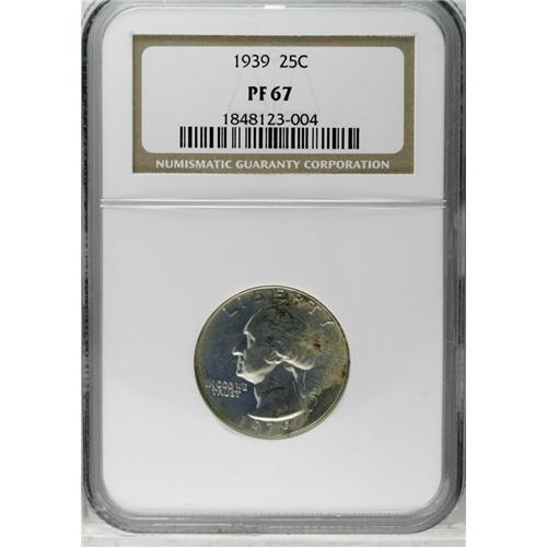 <B>1939<25C> PR67 NGC.</B></I> A sharp Superb Gem with deep mirrors for the issue. Apple-green and cinnamon are the dominant colors in the dappled patina that covers both sides.