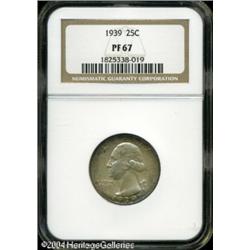 1939 25C PR67 NGC. Fully struck with a coating of <B>1939 25C PR67 NGC.</B></I> Fully struck with a coating of creamy, milky toning, and light speckled patina on the obverse. Well preserved and free of handling marks. Population: 118 in 67, 7 finer (11/04). <BR><BR><B>Important notice:</B> Heritage usually auctions material at the rate of 200-250 lots per hour. On some occasions eBay Live bid software or the Internet may not be able to keep up with the pace of the auction. We recommend placing a realistic absentee bid now as insurance to avoid disappointment. Occasionally the auctioneer may eliminate or reject an eBay Live bid, and the auctioneer may also reopen a lot after the close of the eBay live bidding (usually because we missed an audience bid), and may reject your bid even if it shows you as the winning bidder. By bidding via eBay Live, you agree that Heritage may award the lot to another bidder at its sole discretion under the circumstances described above or any other reasonable circumstances. Since eBay bids are not shown to us until we open the lot on the floor, we treat those bids just like floor bids. In most cases the floor responds before the eBay bid is presented to us, due to Internet lag time, so for consistency we have made it a policy that floor bids are always considered first over tie eBay live bids. Also please note that all Heritage lots purchased through eBay Live carry a 20% Buyer's Premium. Please make sure you read the Terms and Conditions before you bid. This lot is being auctioned in conjunction with a live floor auction by Heritage Galleries & Auctioneers. All final auction and invoice information will be supplied by Heritage Galleries & Auctioneers, and all other information should be considered preliminary. Lot:6011