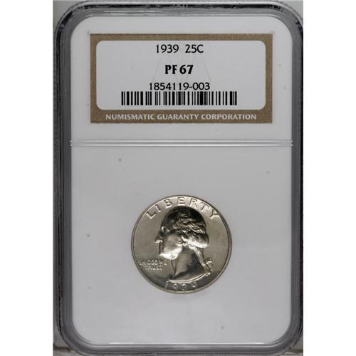 <B>1939 25C PR67 NGC.</B></I> NGC Census: (127/14). PCGS Population (120/2). Mintage: 8,795. Numismedia Wsl. Price for NGC/PCGS coin in PR67: $525. (#5978)<BR><BR><b>Shipping:</b> Coins & Currency (<a target="_blank" href="http://www.heritageauctions.com/common/shipping.php">view shipping information</a>)