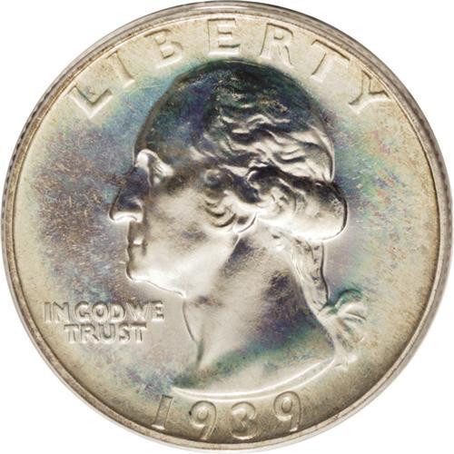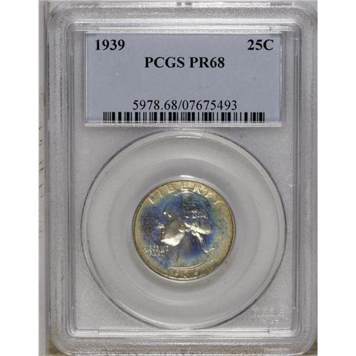 <B>1939 25C PR68 PCGS.</B></I> Iridescent marigold-yellow, radish-red, and lime-green toning enriches this nicely mirrored and intricately struck Superb Gem. Unlike most Washington quarters from this era, the peripheral legends are free from central softness. It would be a challenge to find any other specimen with equally beautiful patina. Population: 2 in 68, 0 finer (10/06).<BR><BR><b>Shipping:</b> Coin/Currency (<a target="_blank" href="http://www.heritageauctions.com/common/shipping.php">view shipping information</a>)