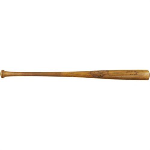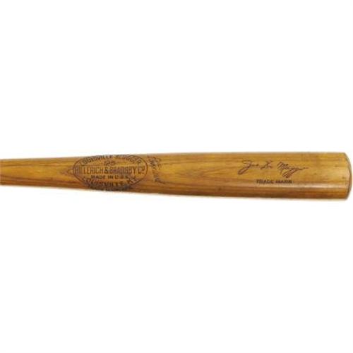 <B>1939-43 Joe DiMaggio Game Issued Bat.</B></I> Identical in style to the bat used during DiMaggio's famed 1941 streak that sold in 2004 for just over $300,000, the offered example will not cause the winning bidder to open his pocketbook quite so wide. The signature model Hillerich & Bradsby was unquestionably created for use by the Yankee Clipper, but never made it into his capable hands, remaining unblemished by the impact of horsehide. We must also note that, for reasons unknown, the top seven-eighths of an inch have been trimmed from the barrel end, shedding about an ounce of weight from the proper thirty-five in the process. There is still much to love, however, particularly the chance for mere collecting mortals to own true DiMaggio lumber. Graded GU4. <I>LOA from Taube & Malta.</B></I><BR><BR><b>Shipping:</b> Clothing, Costumes & Jerseys (<a target="_blank" href="http://www.heritageauctions.com/common/shipping.php">view shipping information</a>)