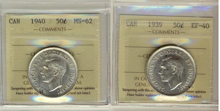 1939 50¢ EF & 1940 ICCS MS62. Lot of 2 coins.