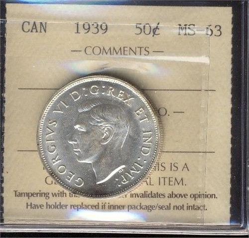 1939 50¢ ICCS MS63. Fully brilliant with hint of gold.
