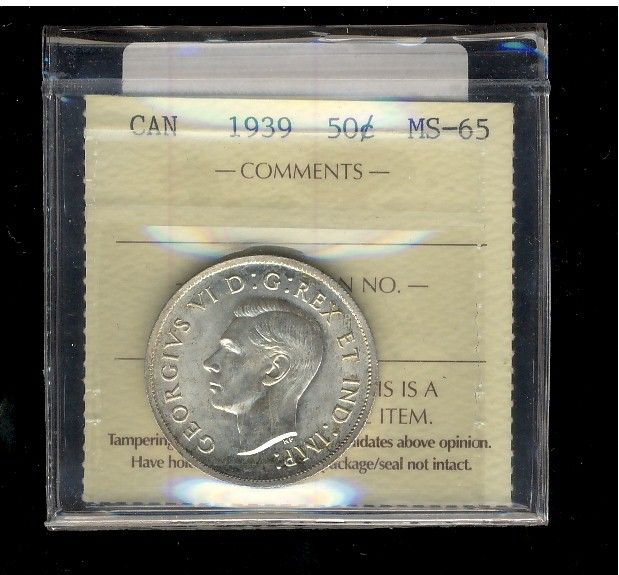 1939 50¢ ICCS MS65. Crystal white issue.
