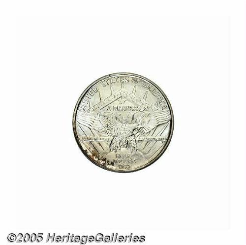<B>1939<50C> Arkansas MS66 PCGS.</B></I> The Philadelphia, Denver, and San Francisco mints each produced 2,100 Arkansas half dollars in 1939, which were sold in sets at $10 apiece. These vanished almost immediately owing to the small mintage, with most sets going to speculators. Collectors and Arkansas residents protested the Arkansas Commission's marketing tactics, which contributed to the later discredit of commemorative halves. When Congress passed the Act of August 5, 1939, revoking all previous authority to manufacture commemorative coins under previous acts, the immediate occasion was indignation over the Arkansas 1939 sets, which enriched coin dealers and speculators. The current 1939 Philadelphia issue is nearly brilliant, displaying just a few faint speckles of gold color over lustrous surfaces, along with some lavender patina at the lower reverse border. The design features are boldly impressed, and the surfaces are devoid of significant abrasions.