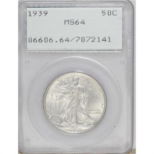 <B>1939 50C MS64 PCGS.</B></I> . PCGS Population (1121/2664). NGC Census: (624/1931). Mintage: 6,820,808. Numismedia Wsl. Price for NGC/PCGS coin in MS64: $70. (#6606)<BR><BR><B>Coin Engraver:</B> Adolph A. Weinman<BR><BR><b>Shipping:</b> Coins & Currency (<a target="_blank" href="http://www.heritageauctions.com/common/shipping.php">view shipping information</a>)