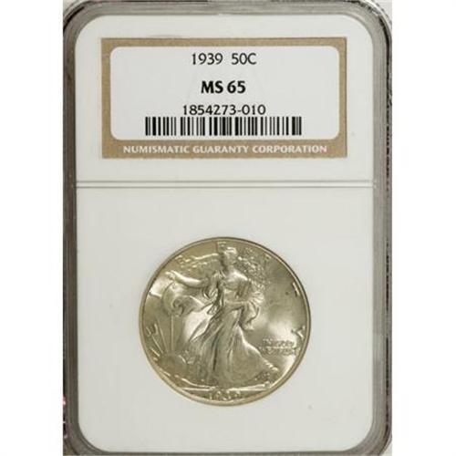 <B>1939 50C MS65 NGC.</B></I> NGC Census: (1018/863). PCGS Population (1432/1184). Mintage: 6,820,808. Numismedia Wsl. Price for NGC/PCGS coin in MS65: $200. (#6606)<BR><BR><B>Coin Engraver:</B> Adolph A. Weinman<BR><BR><b>Shipping:</b> Coins & Currency (<a target="_blank" href="http://www.heritageauctions.com/common/shipping.php">view shipping information</a>)