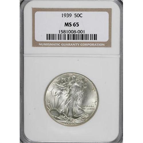 <B>1939 50C MS65 NGC.</B></I> NGC Census: (1021/868). PCGS Population (1442/1196). Mintage: 6,820,808. Numismedia Wsl. Price for NGC/PCGS coin in MS65: $190. (#6606)<BR><BR><B>Coin Engraver:</B> Adolph A. Weinman<BR><BR><b>Shipping:</b> Coins & Currency (<a target="_blank" href="http://www.heritageauctions.com/common/shipping.php">view shipping information</a>)